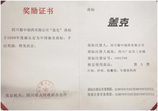 公司高度重视品牌战略,依法注册了“盖克”、“蜀中”、“三星堆”、“阿莫锋”、“益善源”、“蓉通”、“pg模拟器试玩在线”等108件注册商标,1999年“盖克”、2003年“蜀中”、2007年“三星堆”被认定为德阳市知名商标,2001年“盖克”、2004年“蜀中”被认定为四川省著名商标, 2008年“盖克”商标被国家工商行政管理总局认定为“中国驰名商标”。2017年3月,公司盖克牌、pg模拟器试玩在线牌阿莫西林胶囊和多酶片被四川省人民政府授予四川名牌产品称号。2016年,公司实现营业收入66373万元,利税7600万元;2017年,公司实现营业收入75045万元,利税7572万元。公司2017年被命名为德阳市第七批院士专家工作站,2016-2018连续三年被德阳市人民政府确定为重点龙头企业。